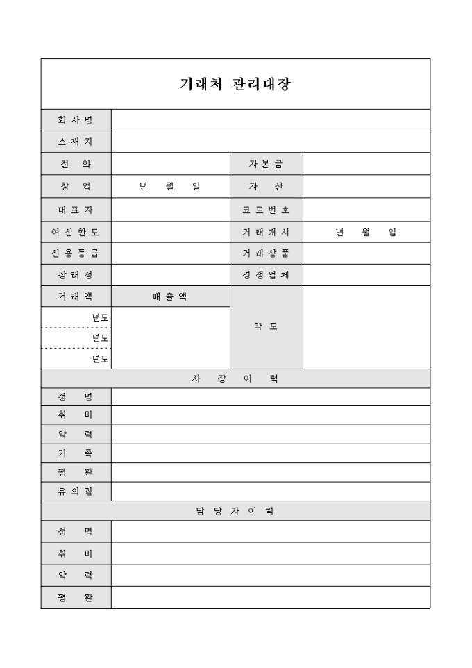 세로로작성된 거래처 관리 대장입니다. 거래업체의 담당자와 대표자의 취미와 성격등을 기록할수 있는 양식입니다.