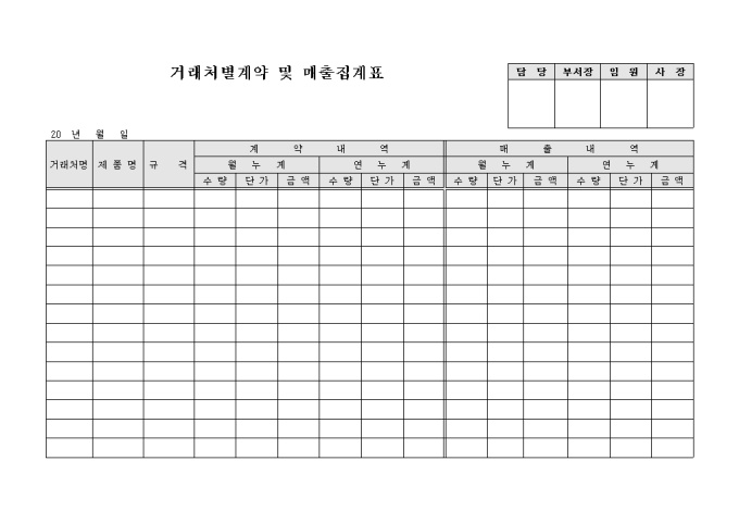 9,000원/월거래처별계약 리스트와 매출의 집계를 한눈에 볼수 있도록 구성된 표입니다. 거래처명과 계약내역, 매출내역등으로 구성되어 있습니다.