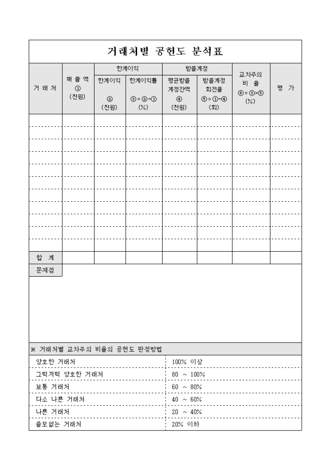 9,000원/월거래처별 공헌도를 분석한 표입니다. 거래처와 매출액, 문제점 등으로 구성되어있습니다.