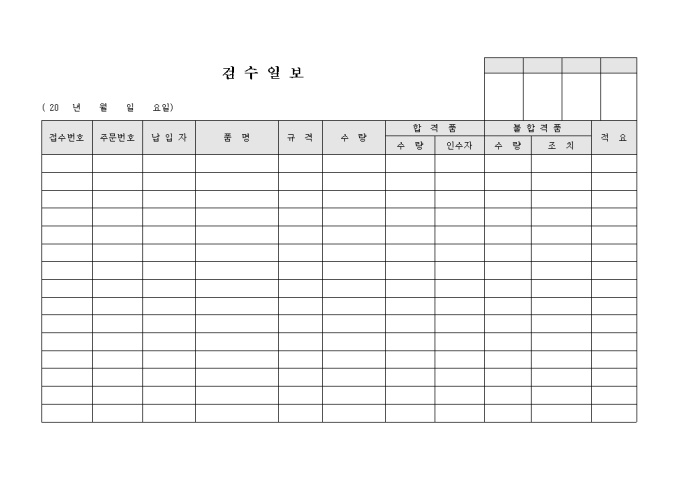 검수에 합격한 물품과 불합격한 물품의 목록을 적을수 있는 검수일보입니다. 접수번호와, 품명, 규격, 합격여부등으로 구성되어 있습니다.
