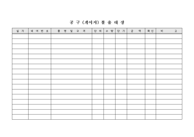 공구불출대장입니다. 공구불출 일자와 대여번호, 단위,수량, 품명, 금액등으로 구성되어 있습니다.