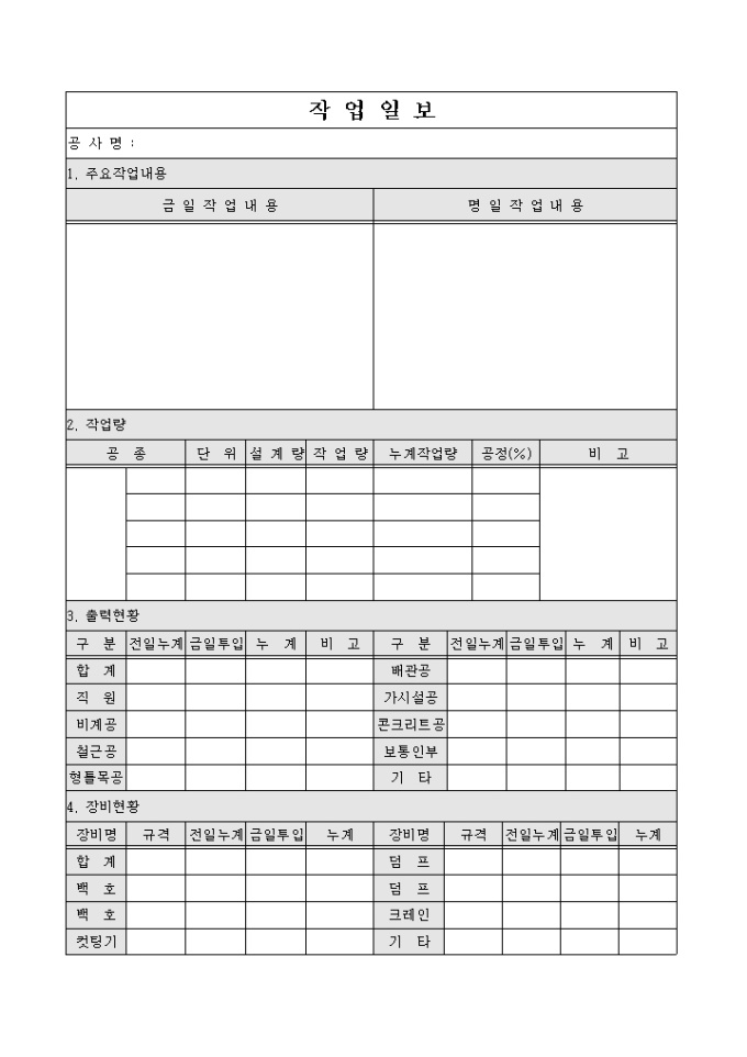 하루의 공사내용을 기록하는 작업일보 입니다. 금일 작업내용과 명일 작업내용, 작업량, 장비현황으로 구성되어 있습니다.