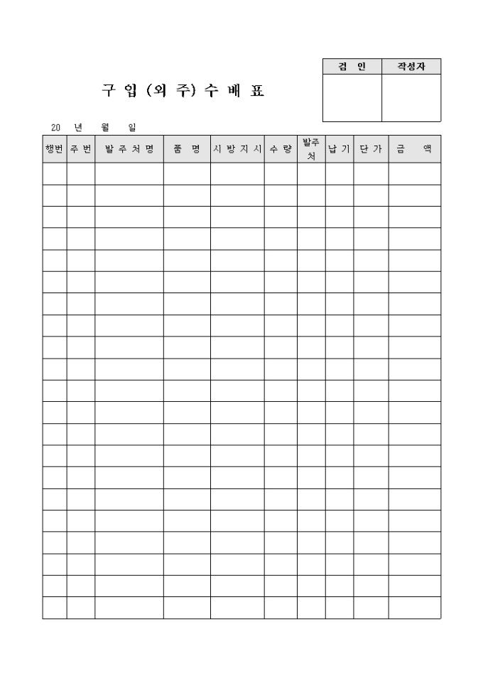 구입,외주 수배표입니다. 발주처명, 수량, 발주처, 납기, 단가, 금액등으로 구성됩니다.
