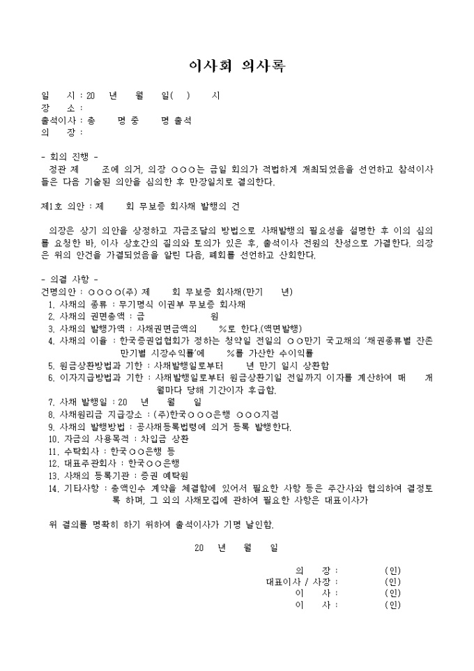 9,000원/월무보증 회사채 발생에 관한 이사회의 의사록입니다.