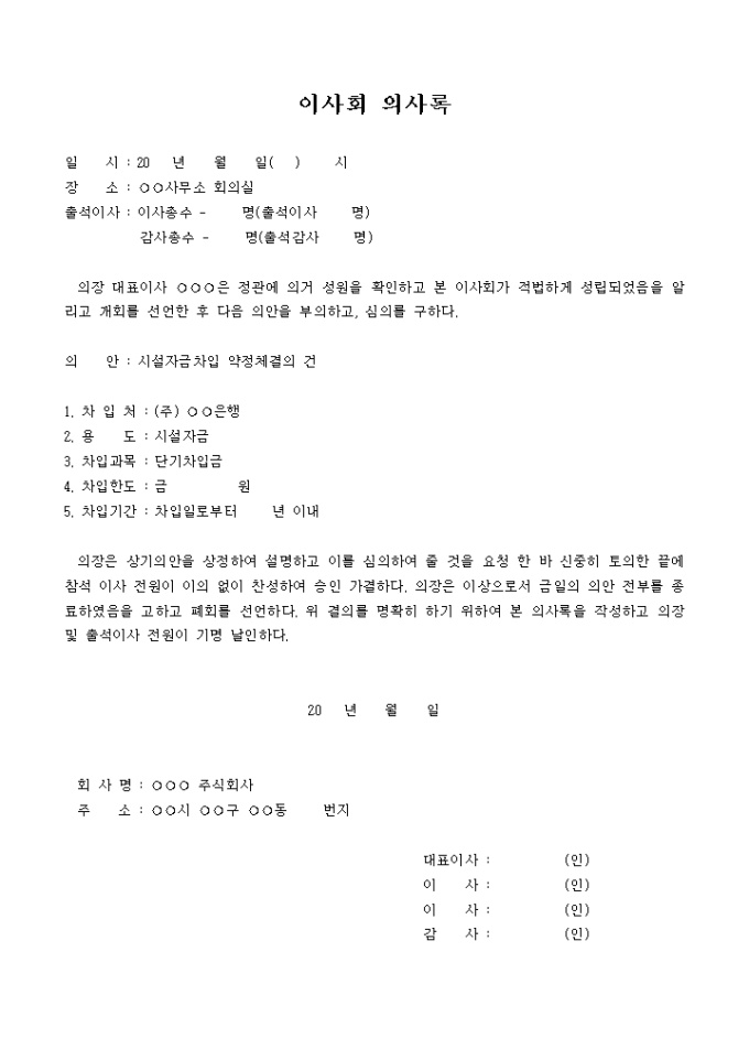9,000원/월시설자금차입 약정체결에 관한 이사회 의사록입니다.