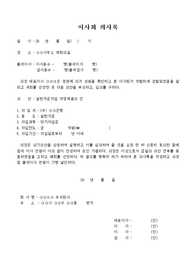 9,000원/월일반 자금 차입 약정 체결에 관한 이사회 의사록입니다.