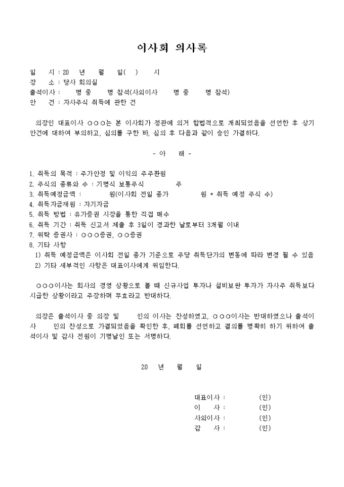 자기 주식 취득에 관한 이사회 의사록입니다.