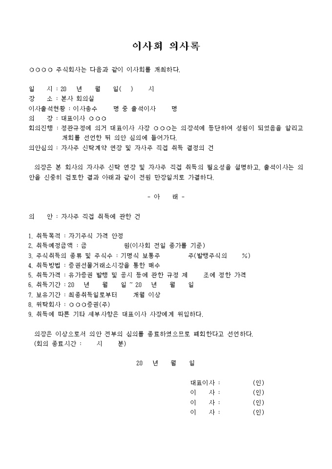 자기 주식 취득 신고서 신탁 계약에 관한 이사회 의사록입니다.