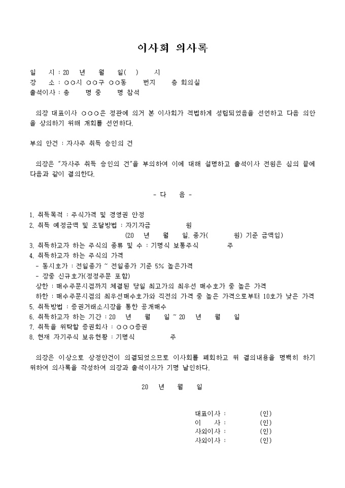 자사주 취득에관한 이사회 의사록입니다.