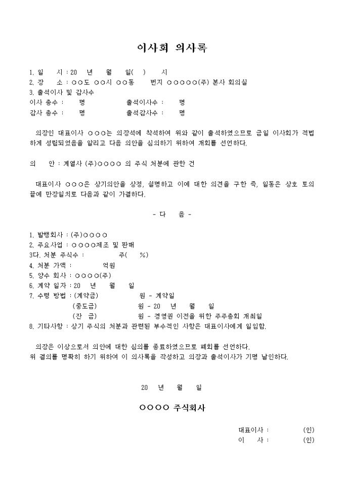9,000원/월자산 양수.도 신고서에 관한 이사회 의사록입니다.