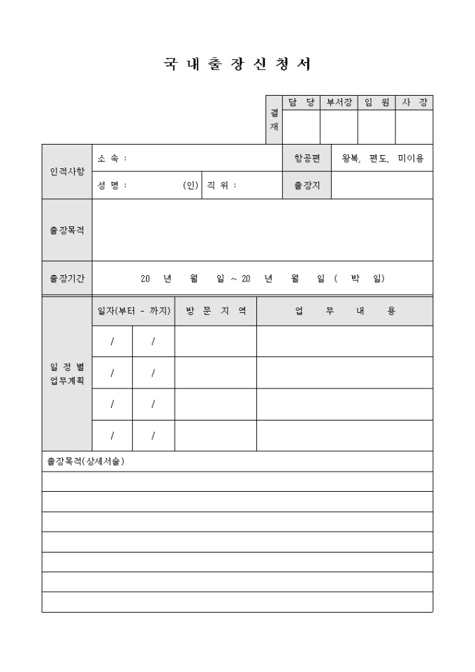 국내 출장시 작성하는 출장신청서 양식입니다. 출장자의 인적사항, 출장목적, 출장기간, 일정별 업무계획, 출장비 청구 등의 항목으로 구성되어 있습니다.