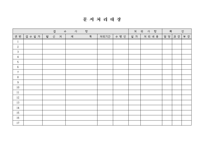 9,000원/월문서처리대장 양식입니다. 문서의 접수사항과 처리사항 등의 항목으로 구성되어 있습니다.