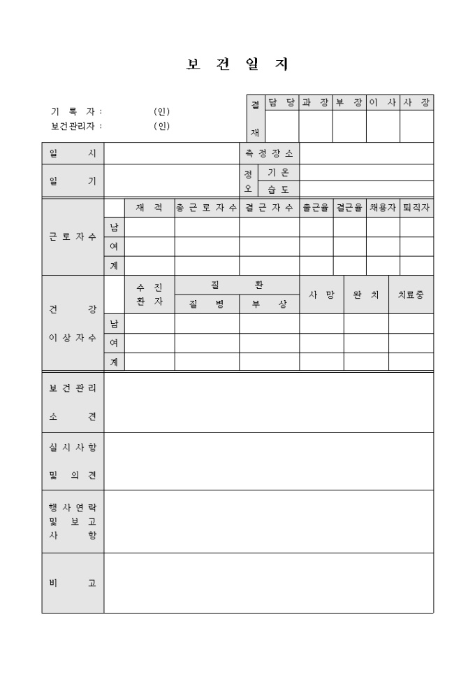 9,000원/월근로자들의 질병상태나 위생상태를 체크하기 위한 보건일지 양식입니다. 근로자수 건강이상지수, 보건관리소견, 실시사항및 의견, 보고사항 등의 항목으로 구성되어 있습니다.