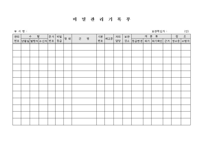 9,000원/월비밀문서에 대한 관리를 위한 기록부 양식입니다. 문서의 수발, 문서번호, 비밀등급, 형태, 건명, 처리담당, 보관장소, 재분류 등의 항목으로 구성되어 있습니다.