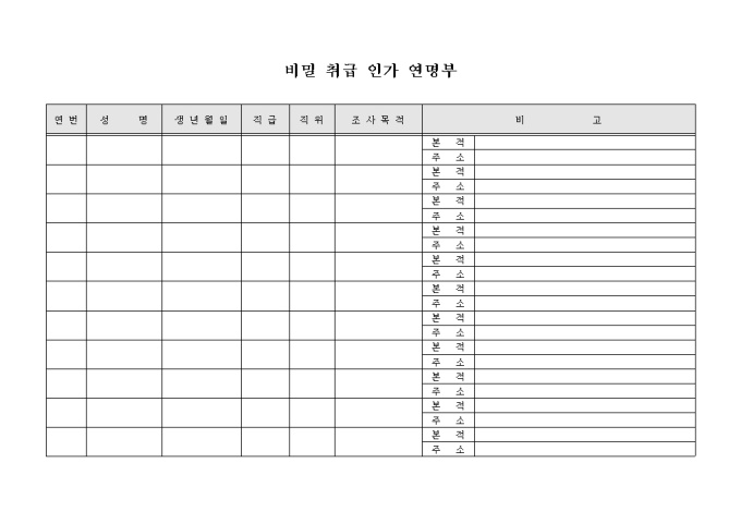 비밀 취급 인가를 받은 사람들을 기록하기 위한 연명부 입니다. 비밀취급인가자들의 성명, 생년월일, 직급, 직위, 조사목적, 비고(본적/주소) 등의 내용을 기재할 수 있습니다.