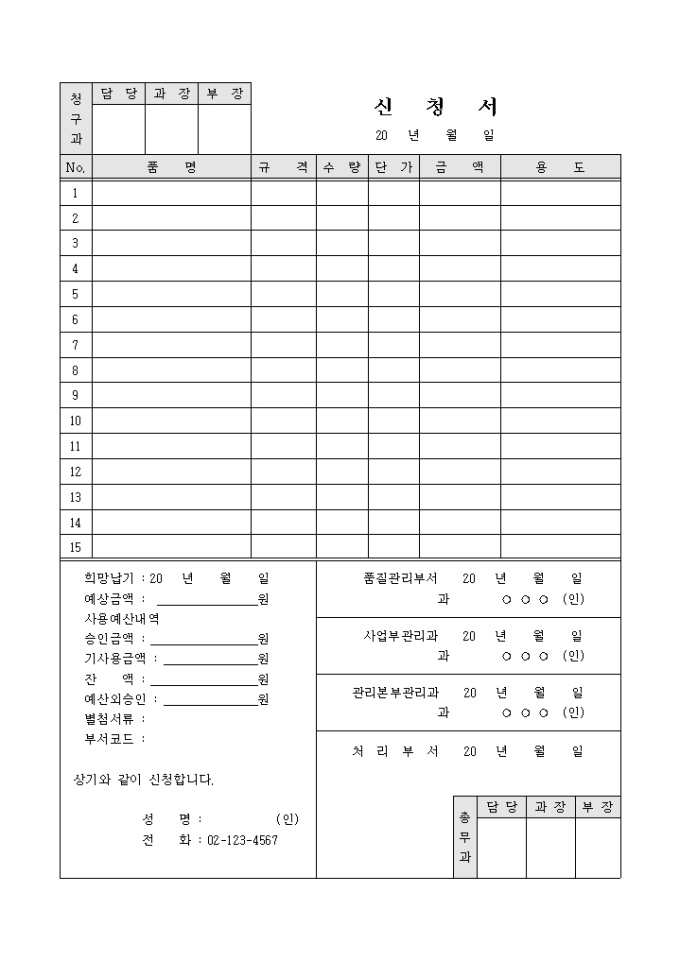물품청구신청서로 품명, 용도, 희망납기일, 처리부서, 별첨서류 등의 항목으로 구성되었습니다.