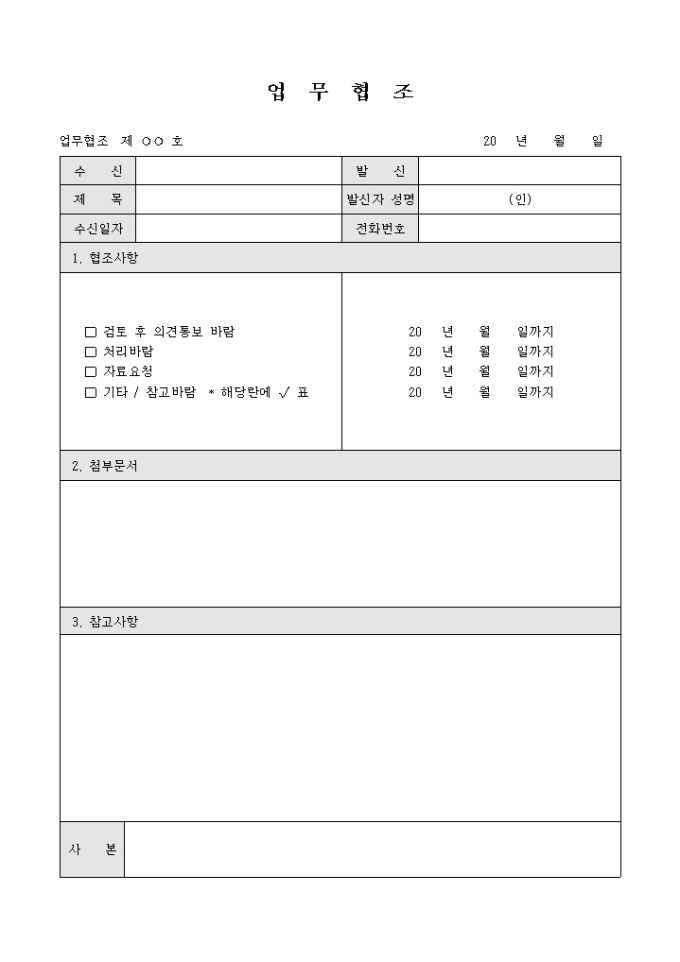 9,000원/월업무협조 요청시 제목, 발신자성명, 전화번호, 협조사항, 첨부문서, 참고사항등을 기입할 수 있습니다.