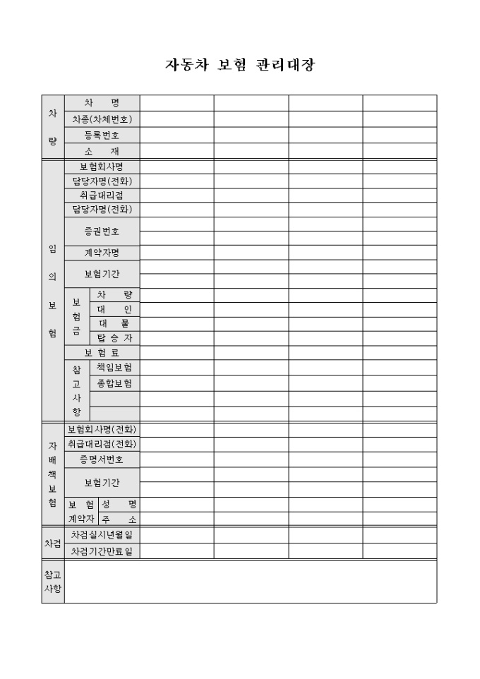 9,000원/월자동차 보험에 대한 전반적인 관리대장으로서 차량정보, 임의보험, 자배책보험, 차량검사(차검) 비고란으로 구성된 서식입니다.