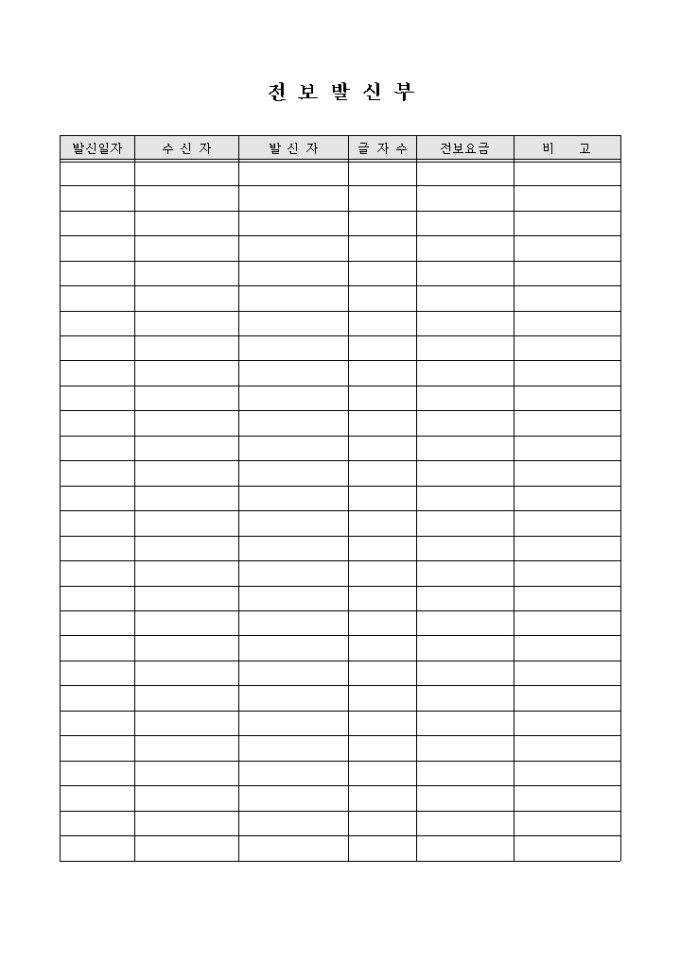 전보의 발신내용을 수신자, 발신자, 글자수, 정보료등의 내용으로 기록하는 장부 양식입니다.