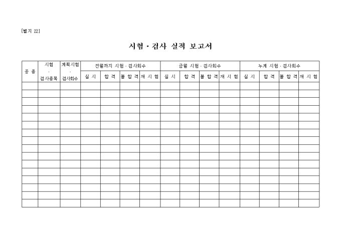 공종,시험,계획시험,전월까지 시험 검사회수,금월 시험 검사회수의 세부 항목으로 구성된 양식입니다.