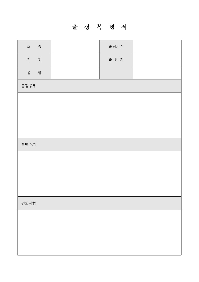 출장복명서입니다. 출장용무, 복명요지, 건의사항등으로 구성되어 있습니다.