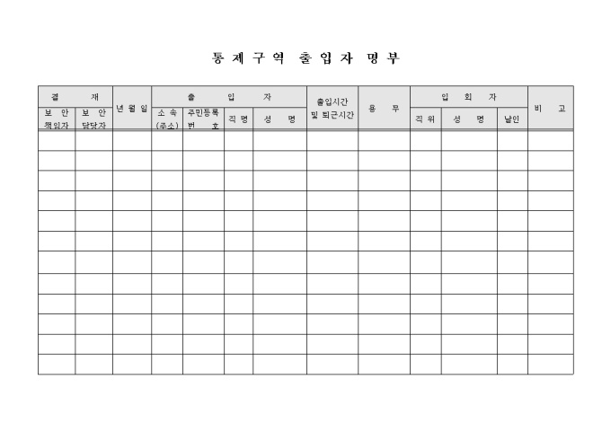 9,000원/월통제구역 출입자명부입니다. 담당자의 결재, 출입자의 인적사항, 입회자등으로 구성되어 있습니다.