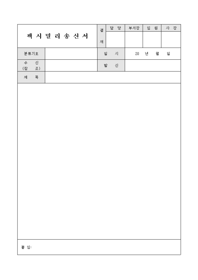 팩스송신서입니다. 팩스의 내용과 제목 일시등을 기록할수 있는 결재문서입니다.