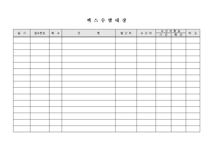 9,000원/월팩스수발대장입니다. 일시, 매수, 건명, 발신처, 수신처, 통보등으로 구성되어 있습니다.