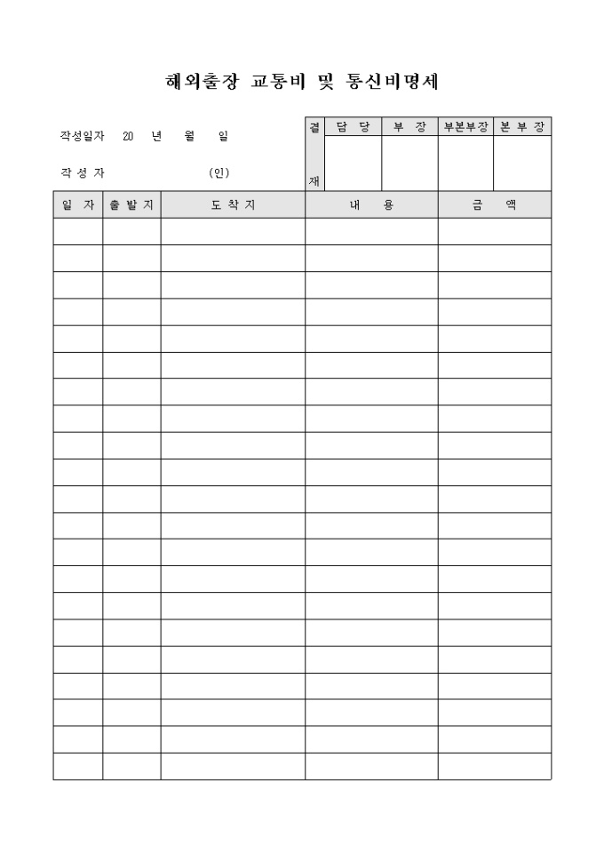 9,000원/월해외출장 교통비 및 통신비명세표입니다. 해외출장동안 사용했던 비용을 기록하여 보고하는데 사용하는 문서입니다.