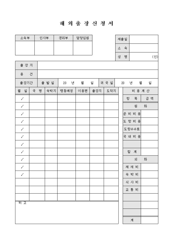 9,000원/월해외출장신청시 사용되는 문서입니다. 날짜별 이동계획과 비용등을 기록할수 있는 문서입니다.