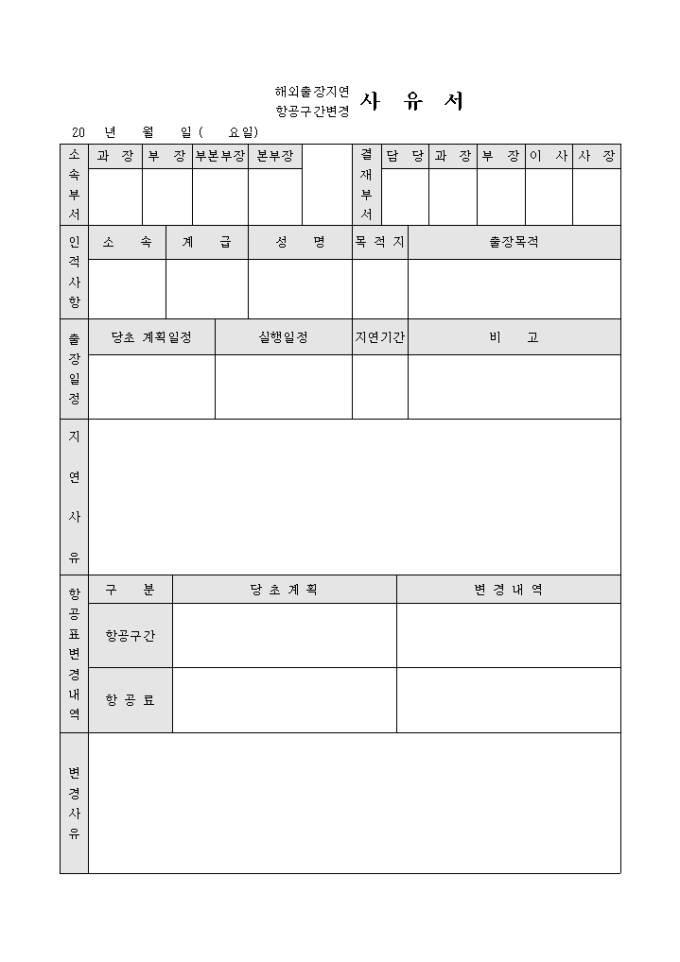 9,000원/월해외출장이 지연되거나 항공구간이 변경되어 사유서를 제출할때 사용되는 문서입니다. 지연사유와 항공표변경 사유등으로 구성되어 있습니다.
