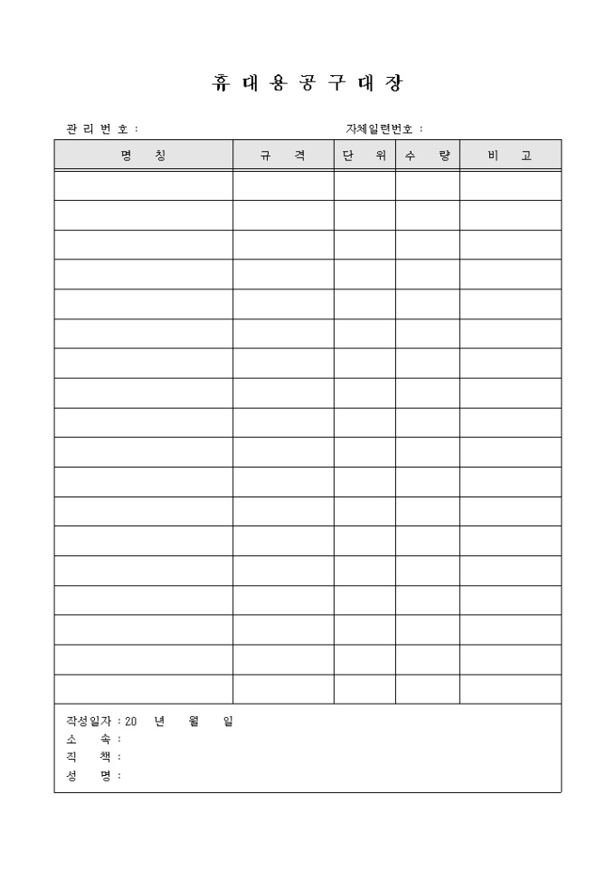 9,000원/월휴대용 공구대장입니다. 휴대용공구의 명칭과 규격, 단위, 수량등으로 구성되어 있습니다.