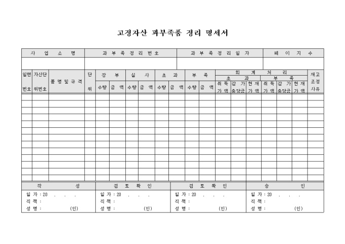 9,000원/월고정자산에 대한 과부족품 정리 명세서 양식입니다. 자산단위번호, 품명및 규격, 장부/실사/초과/부족에 대항 수량과 금액, 회계처리, 재고조정사유 등의 항목으로 구성되어 있습니다.