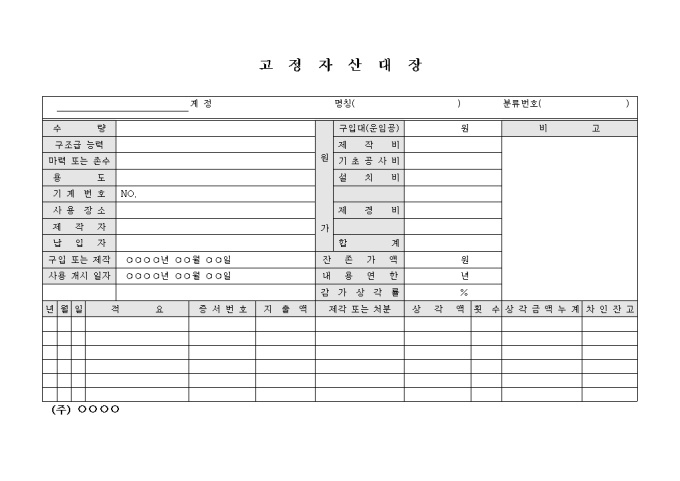 고정자산을 관리, 정리하기 위한 관리대장 양식입니다.