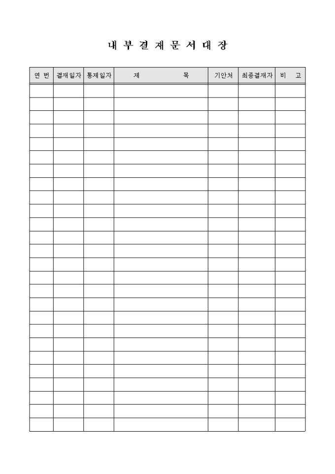 내부결재문서대장 양식으로 결재일자, 통제일자, 제목, 기안처, 최종결재자 등의 항목으로 구성되어 있습니다.