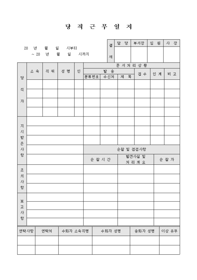 9,000원/월당직근무일지 양식으로 당직자 인적사항, 문서처리 사항, 지시사항, 조치사항, 보고사항과 순찰및 점검사항 등을 기재할 수 있는 당직근무일지 양식입니다.