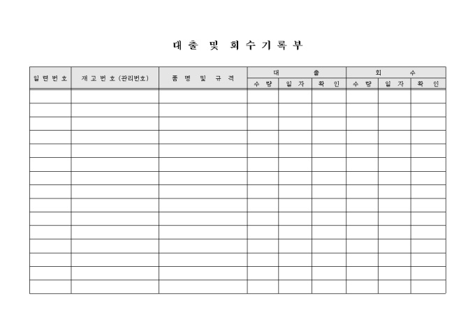 9,000원/월대출 및 회수 기록부 양식으로 재고번호와 품명및 규격, 대출/회수 수량, 일자 등을 기록할 수 있습니다.