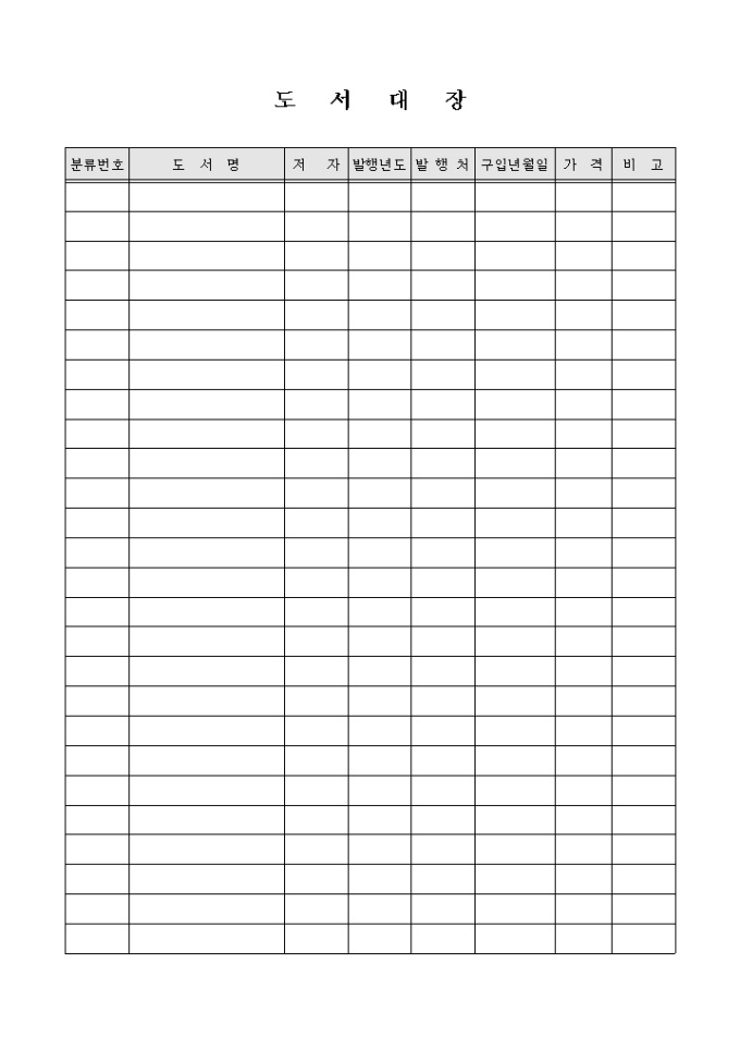 9,000원/월도서의 도서명, 저자, 발행년도, 발행처, 구입년월일, 가격 등을 기록 할 수 있는 도서대장 양식입니다.
