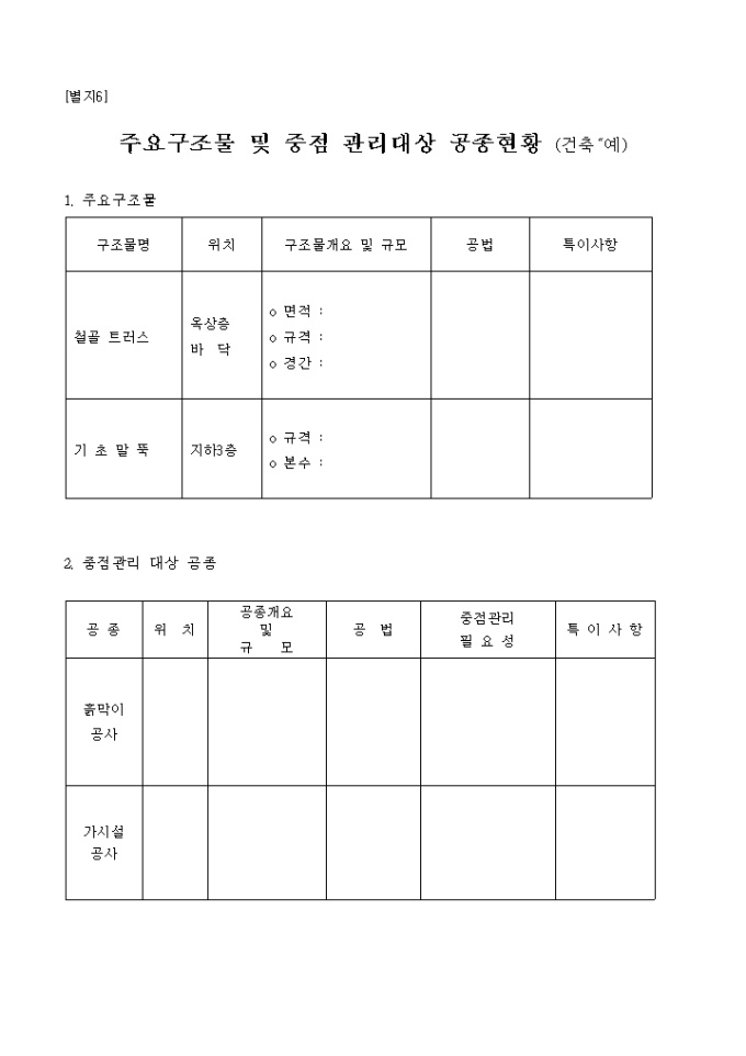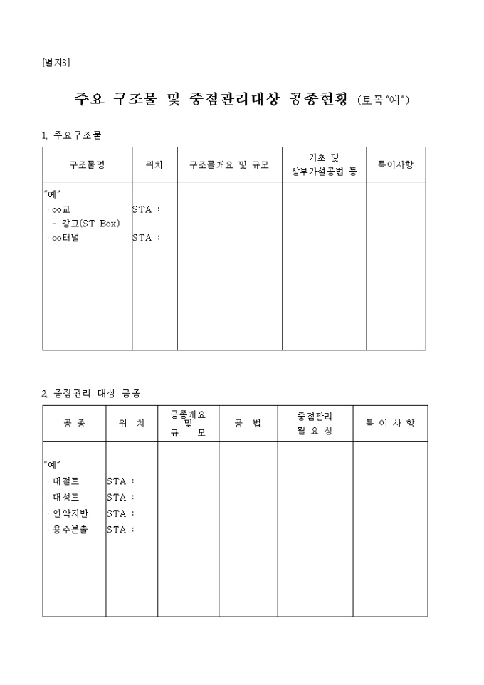 주요구조물및중점관리대상공종현황(예) 입니다.