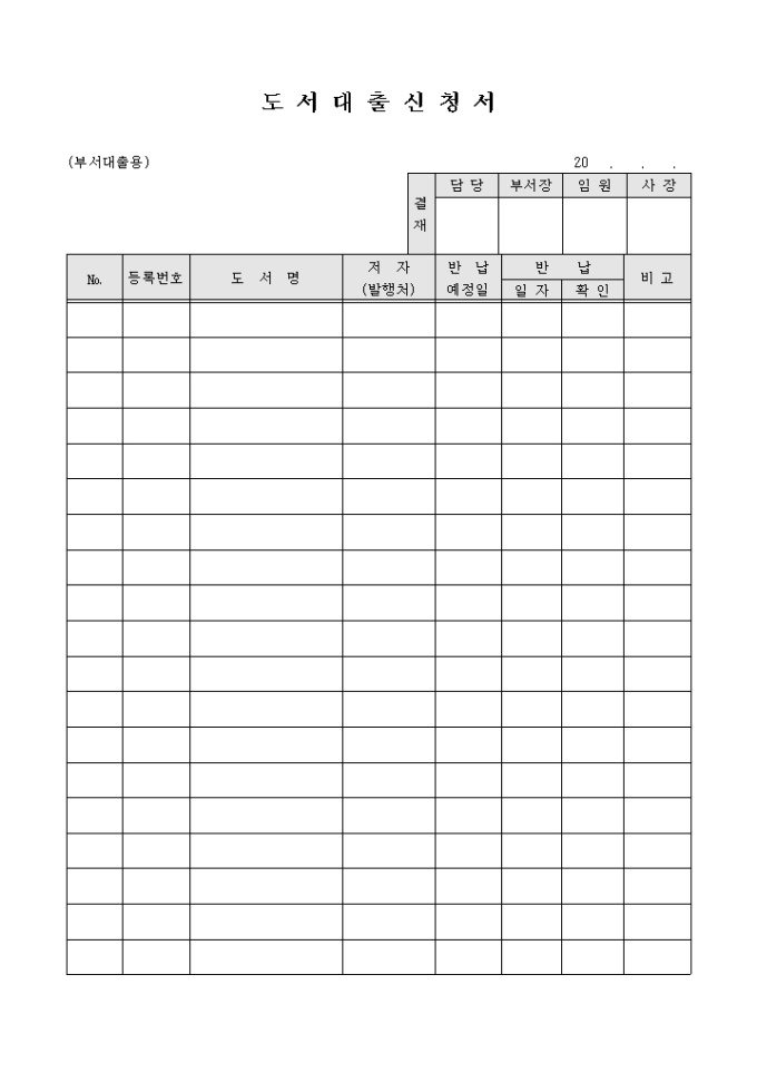 도서대출신청서 양식입니다. 도서명, 저자, 반납예정일, 반납확인 등의 항목으로 구성되어 있습니다.