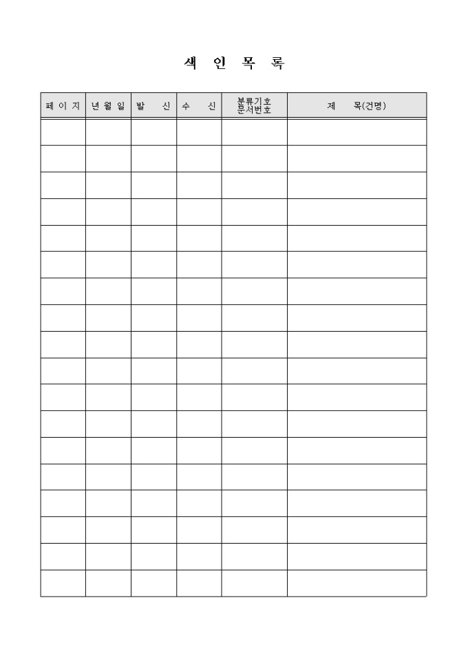 9,000원/월기본적으로 사용하는 색인목록으로 페이지, 년월일, 발신, 수신, 분류기호, 제목 등의 항목을 포함하고 있습니다.