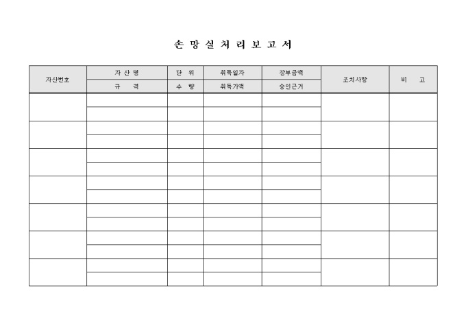 9,000원/월자산번호, 자산명, 단위, 수량, 취득일자, 취득가액, 조취사항 등으로 구성된 손망실처리보고서입니다.