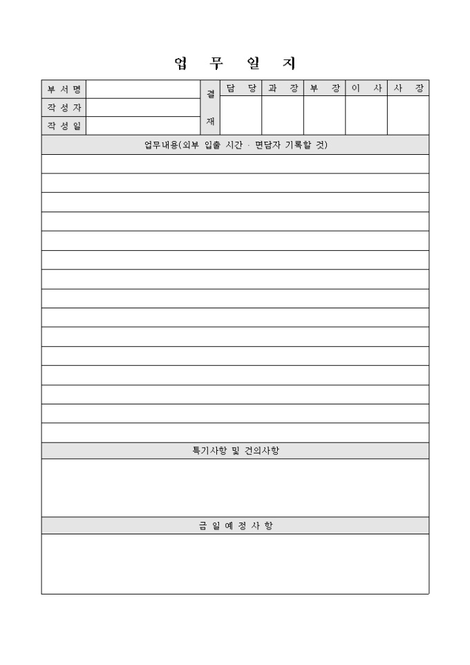 9,000원/월부서명, 작성자, 일자, 업무내용 결제란으로 구성된 업무일지입니다.