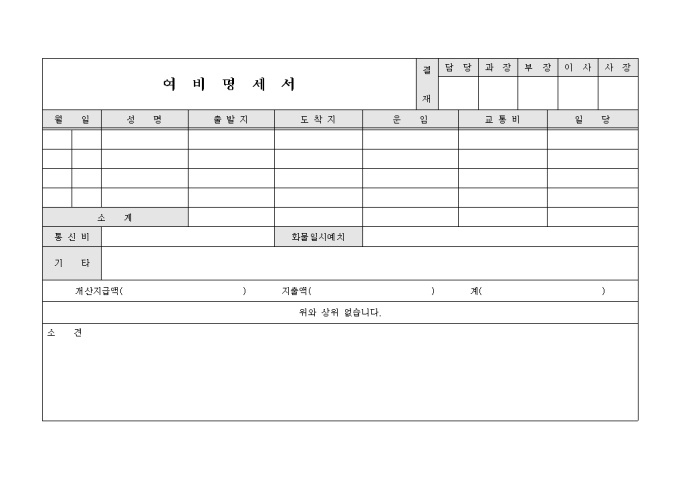 9,000원/월여비 사용내역을 기입 할 수 있도록 성명, 출.도착지, 운임, 교통비 등의 항목으로 구성된 여비명세표입니다.