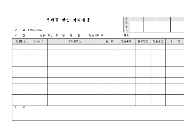 9,000원/월우편물 발송의뢰시 수신국, 수신인주소, 요금내역 등을 기입할 수 있는 발송의뢰서입니다