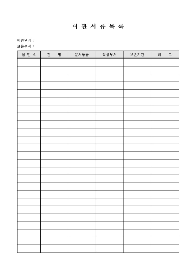 다른 부서로 이관할 서류에 대하여 철번호, 건명, 문서등급, 작성부서, 보전기간 등의 항목으로 구성되었습니다.