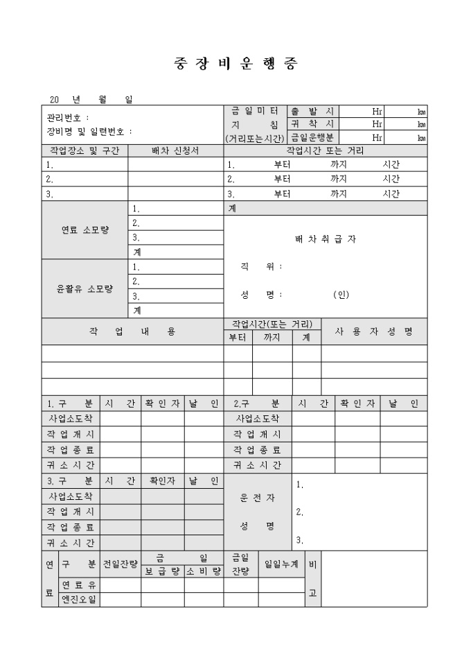 9,000원/월중장비를 운행하기전 제출하는 문서로써 중장비 운행시간과 작업내용등으로 구성되어 있습니다.