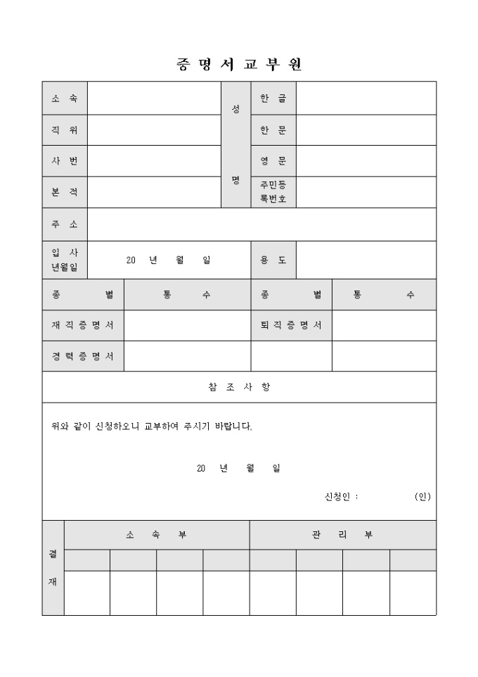 9,000원/월증명서를 교부받기 위해 사용되는 문서입니다. 교부받을 증명서의 종류와 통수의 기입이 가능합니다.