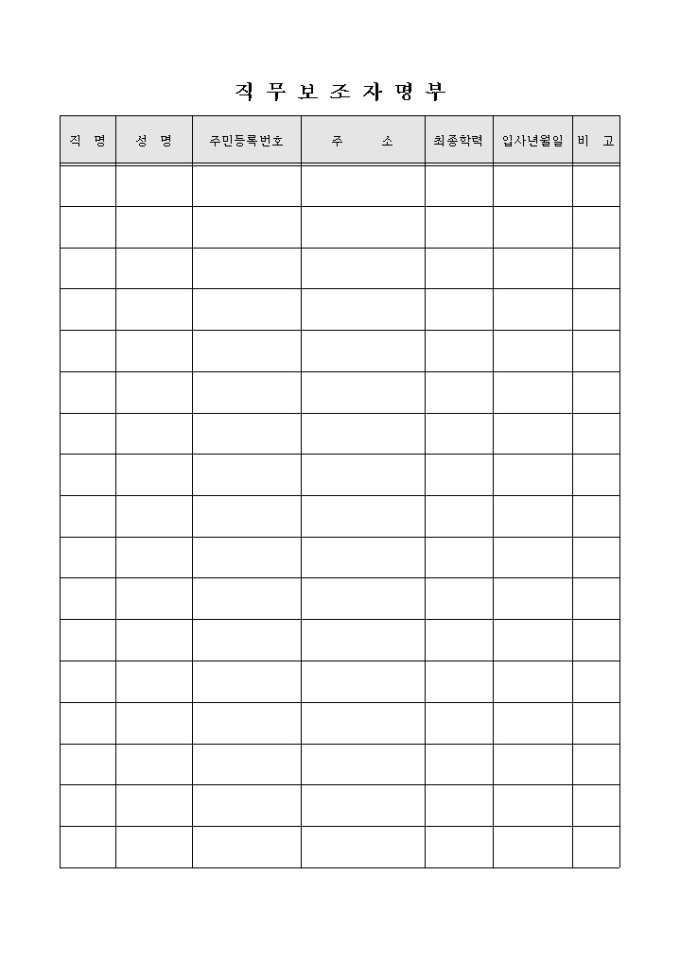 9,000원/월직무보조자 명부양식입니다. 직무보조자의 직명, 성명, 주민등록번호, 입사년월일 등으로 구성되어 있습니다.