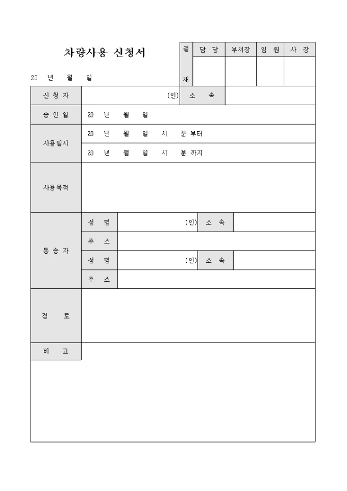 9,000원/월차량사용 신청서 입니다. 사용일시, 목적, 동승자, 경로등으로 구성되어 있습니다.